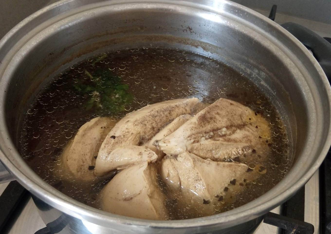 - En la olla donde se va a cocinar, se le agrega el agua hasta que cubra el pollo. En la imagen se ve hasta donde estaba el agua y lo que se evaporó. Nótese que la olla es pequeña, como de 2 litros.