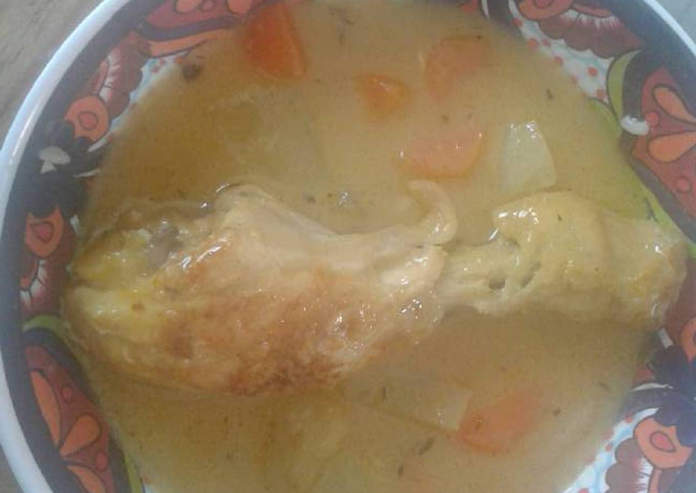 - Ya doradas las papas, se echa el pollo frito, el jugo de naranja, 5 hojas de laurel, una cucharadita de tomillo, 1 cucharada de caldo de pollo en polvo y mover para integrar todo..... cocer hasta que la papa y la zanahoria esté bien cocida......