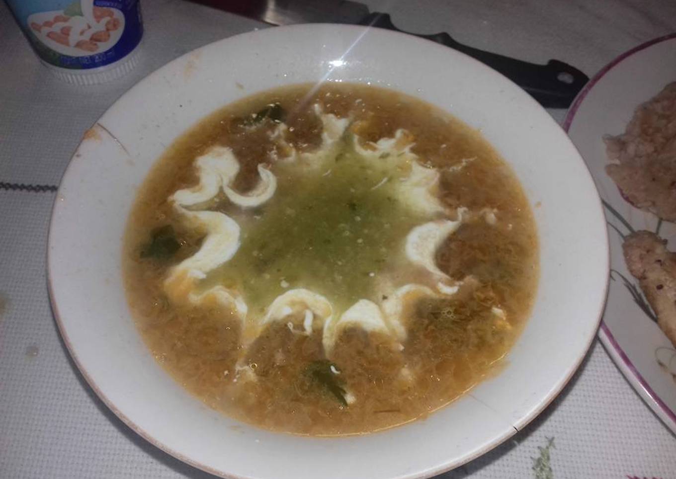 - Poner una cazuela a calentar a fuego bajo con manteca, al humear sofreír el ajo, cebolla, rajas y jitomate con sal. Ahora echarle el caldo y dejar hervir moviendo de vez en cuando. Hervido un poco poner el orégano y dejar en el fuego, subir la flama a que hierva, cuando esta hirviendo poner en el plato hondo, estrellar un huevo sobre el caldo, dejar que se cueza y llevar a la mesa. Acompañar con salsa, tortillas calientes y jugo de limón.