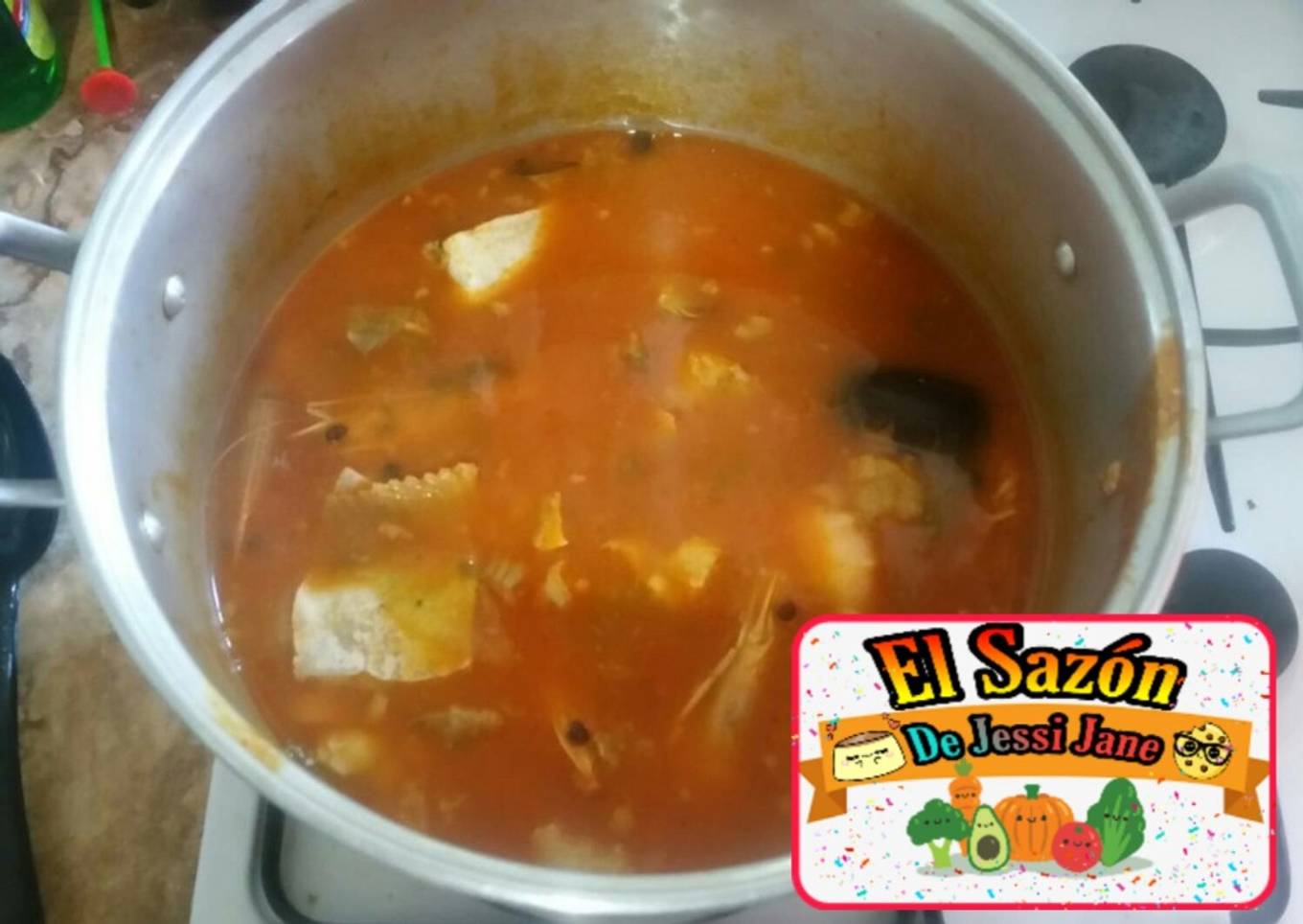- Ponemos aceite de oliva a calentar en nuestra olla y añadimos la salsa la freímos y añadimos las verduras precocidas, echamos una ramita de cilantro y pimienta, agregamos el pescado con todo y su caldo donde se cocino, dejamos que hierva retiramos la ramita de cilantro y sazonamos con el caldo en polvo, listo para degustar puede acompañarse con bolillo y añadir al caldo limón.