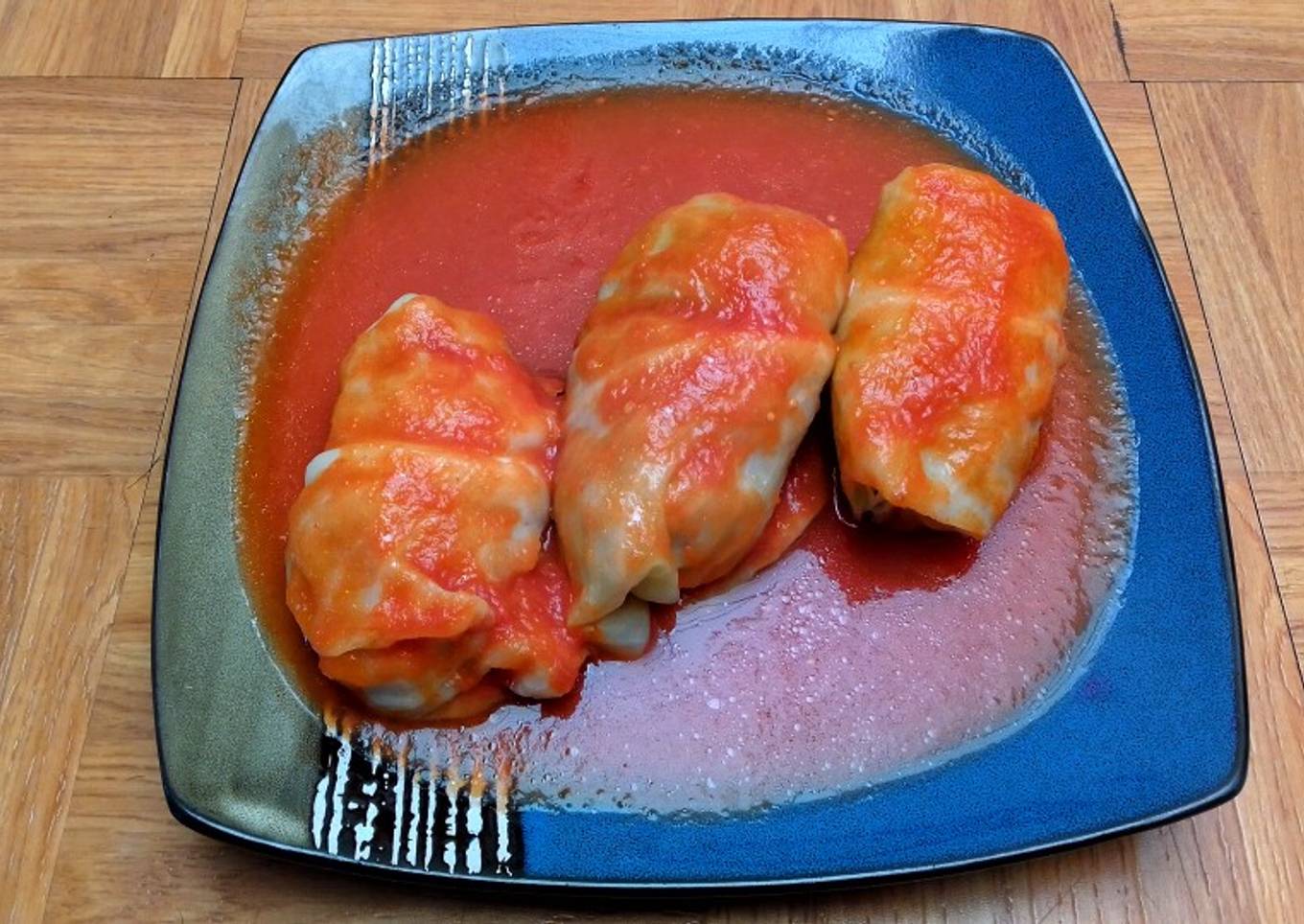 - Agregamos la mezcla de carne al repollo, lo enrollamos y lo colocamos de una vez en nuestro recipiente para baño María.