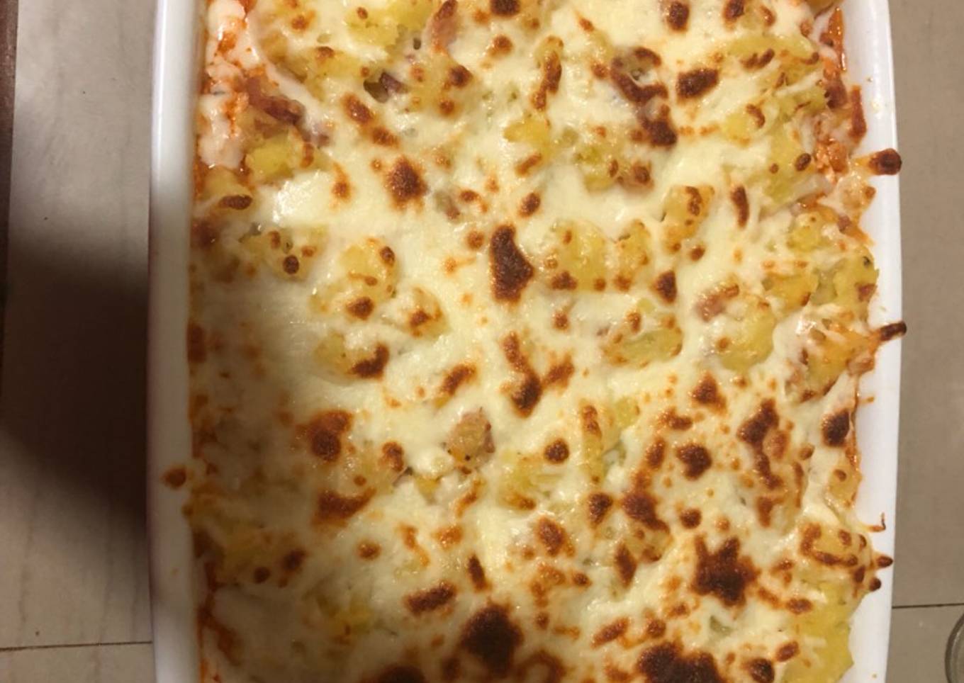 - Poner una capa de pollo en salsa y luego otra de papa y por último queso