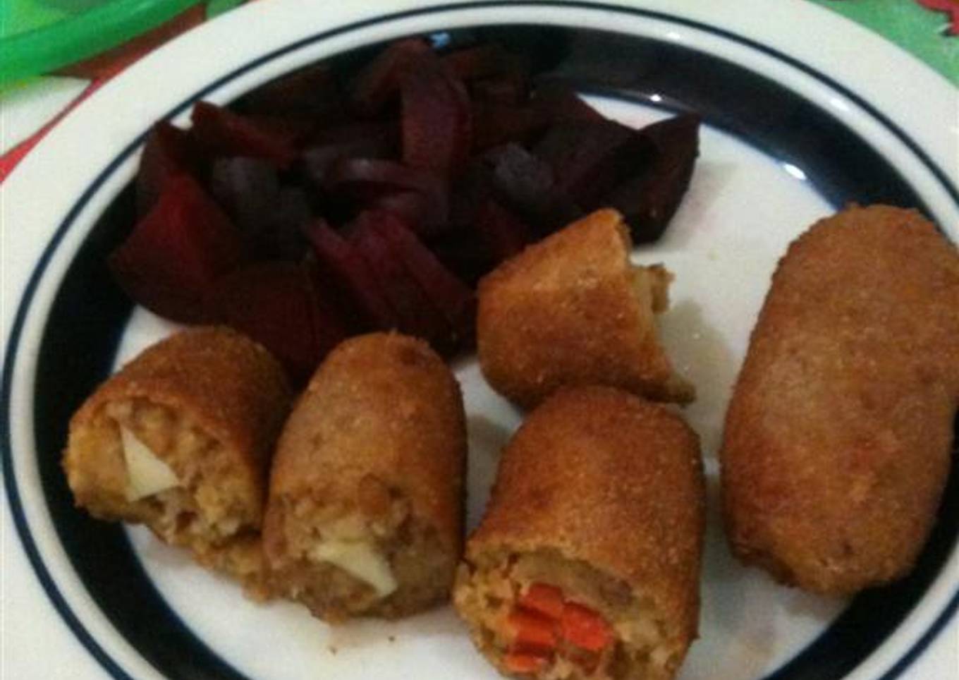 Del día anterior habían quedado unas piezas de pollo cocinado y decidí hacer unas croquetas. Cuando las estaba preparando se me ocurrió rellenarlas con queso, otras con vegetales, otras con aceitunas
